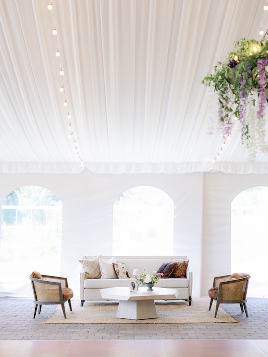 Inside the tent, the design shifted into something immersive and transportive. Gaby’s love of trees became a central inspiration, and the goal was to bring that feeling indoors in a way that felt natural and refined.